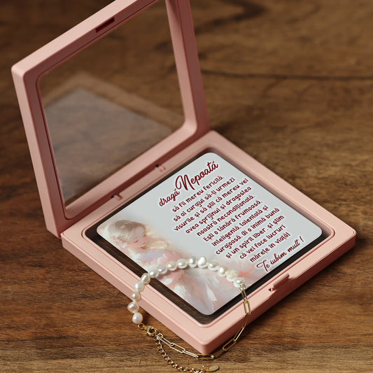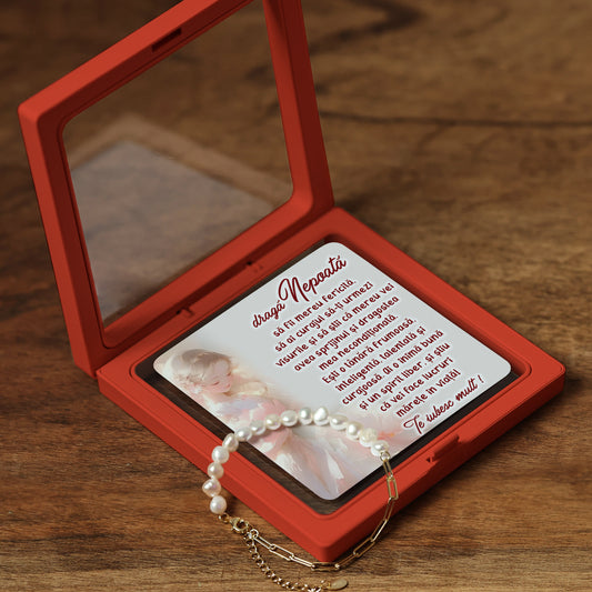 Cadou pentru Nepoată ❤ Brățară din argint placat și perle, cu mesaj singular, ramă 3 culori